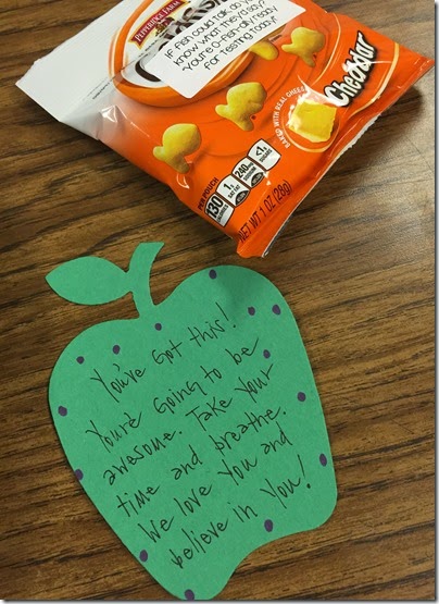 We started testing Monday. Everyone was so excited to come in and see the notes from home and treats from the teacher!
